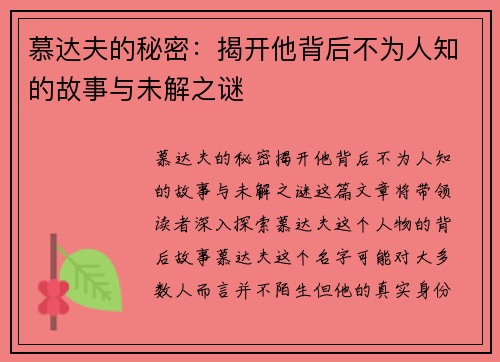 《慕达夫的秘密:揭开他背后不为人知的故事与未解之谜》这篇文章将带领读者深入探索慕达夫这个人物的背后故事。慕达夫,这个名字可能对大多数人而言并不陌生,但他的真实身份、动机和他身上的一系列未解之谜却一直没有得到充分的揭示。本文将从四个方面详细解读慕达夫的神秘面纱:一是慕达夫的历史背景与个人成就,二是他曾经的重大秘密与丑闻,三是他与其他历史人物的错综复杂关系,四是关于慕达夫死亡的未解之谜。通过这些层面的深入分析,读者不仅能够更清楚地了解慕达夫的生平,还能从中窥见一个复杂且充满谜团的人物形象。